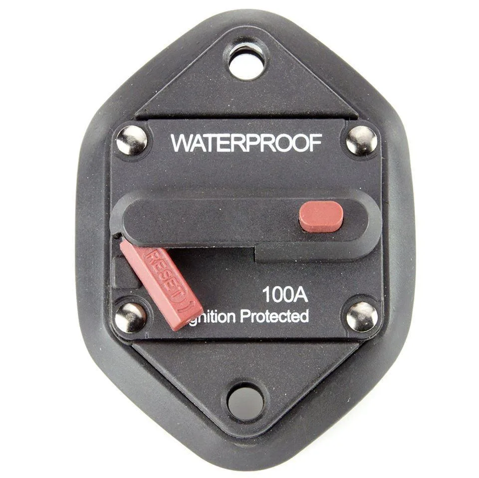 The AMC HCB100P is a 100A panel-mount, manual-reset thermal circuit breaker with IP67 waterproof and ignition protection, designed for reliable DC circuit protection in marine, RV, automotive, and off-grid systems.