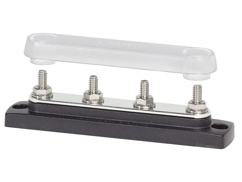 The Blue Sea Systems 2307 busbar is ideal for power distribution or negative return consolidation, handling loads up to 150A in DC systems up to 48V and AC systems up to 300V. It features four studs for 6.4mm ring terminals, a tin-plated copper construction for superior conductivity and corrosion resistance, and a high-impact glass-filled plastic base. The clear polycarbonate cover provides protection against shorts and damage by easily fitting over the stud terminal nuts.