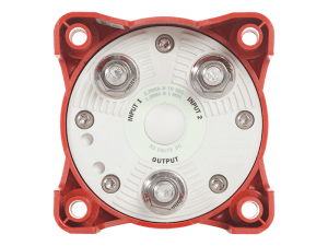Blue Sea Systems e-Series 9001e 1/2/1+2/OFF marine battery selector & combiner switch for use with inboard petrol and diesel engines. This switch has a 350A continuous current rating, a maximum cranking/starting rating of 1200A for 30 secs and a voltage rating of 32V DC, making it suitable for use with 12V & 24V systems.