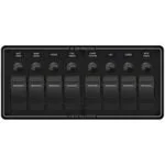 The Bluesea Systems Contura 8371 water resistant 8 position panel, is designed for open cockpit and flybridge applications, using switches to complement the existing controls commonly used on many boats. Its rugged design ideally handles above deck conditions including salt spray, rain, hose washdowns as well as momentary immersions, utilising its water tight mounting gasket. ON indicating LEDs are embedded in all switches. The panel can be used on both 12v and 24v systems, with a maximum operating voltage of 24v DC. Switch rating 20A @ 12v DC and 15a @ 24v DC. Its circuit breaker rating is 15A, and the fuse holder rating is 20A Max (15A fuses included)