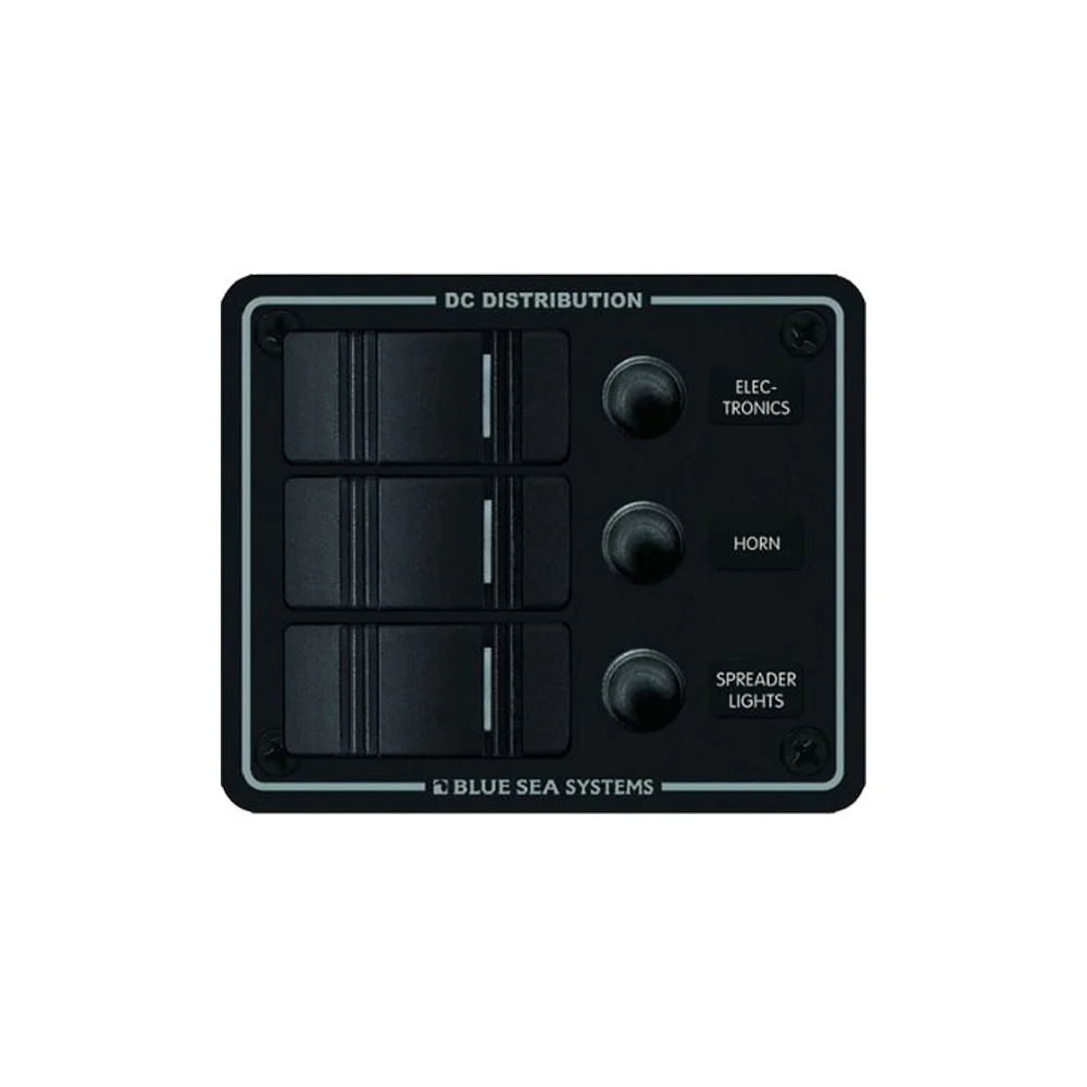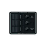 The Bluesea Systems Contura 8374 water resitant 3 position panel, is designed for open cockpit and flybridge applications, using switches to complement the existing controls commonly used on many boats. Its rugged design idelly handles above deck conditions including salt spray, rain, hose washdowns as well as momentary immersions, utilising its water tight mounting gasket. The panel can be used on both 12v and 24v systems, with a maximum operating voltage of 24v DC. Switch rating 20A @ 12v DC and 15a @ 24v DC. Its circuit breaker rating is 15A, and the fuse holder rating is 20A Max (15A fuses included)