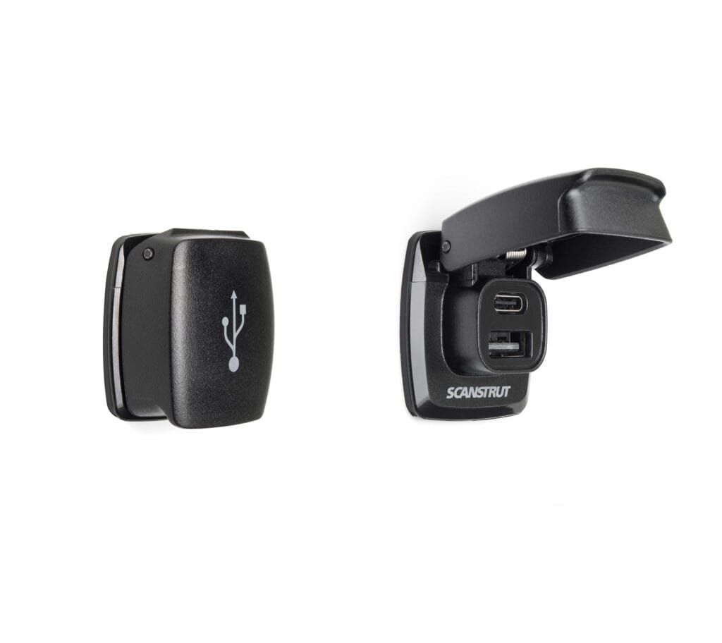 12/24V Fast Charge Dual USB-A/C Socket SC-USB-F1 Ultra-fast USB charging for the next generation boater. Flip Pro is designed for use with either a 12V or 24V input and features 1x USB-A and 1xUSB-C charging port. This provides the optimum choice of connection for any device and the fastest charging for your device onboard. When not in use, the spring-loaded cap remains tightly closed, protecting the ports from the elements. When charging, it quickly locks open to protect your cables when plugged in. Featuring a super compact footprint, Flip Pro is constructed from premium, marine-grade materials and is IPX4 waterproof, making it completely washdown-ready. Flip Pro is FAST! It will charge at up 36W on a 12V system or up to 60W on a 24V system. This makes it perfect for charging modern laptops via the USB-C port. It’s also 2x faster for charging large tablets and is designed to effortlessly charge both an iPad Pro & iPhone at the same time. The install cut out matches those of standard USB sockets for easy retrofit or swap of an existing USB charger, allowing you to keep up with the heavier power draws of modern electronic devices.