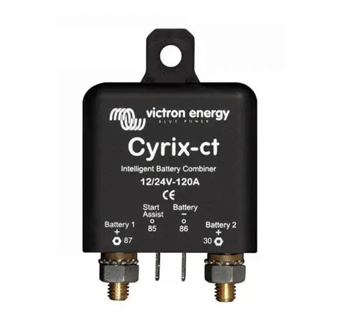 The Victron Cyrix-CT 12/24 intelligently connects and disconnects batteries for parallel charging, protects against overload, prioritises the starter battery, and operates efficiently with minimal voltage loss in marine, RV, and off-grid systems.
